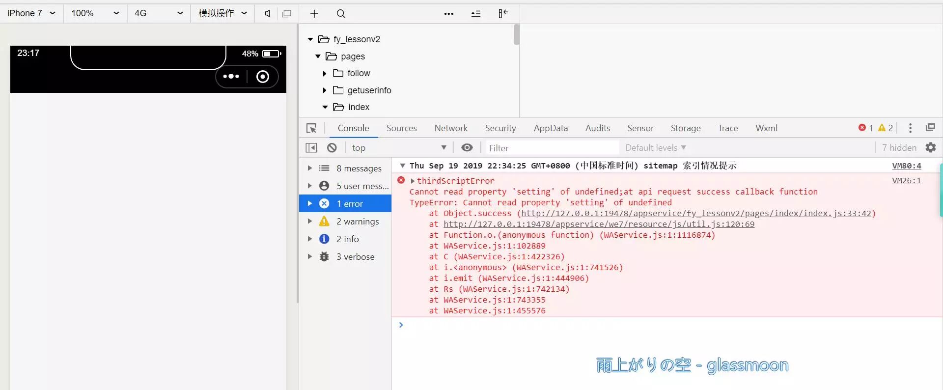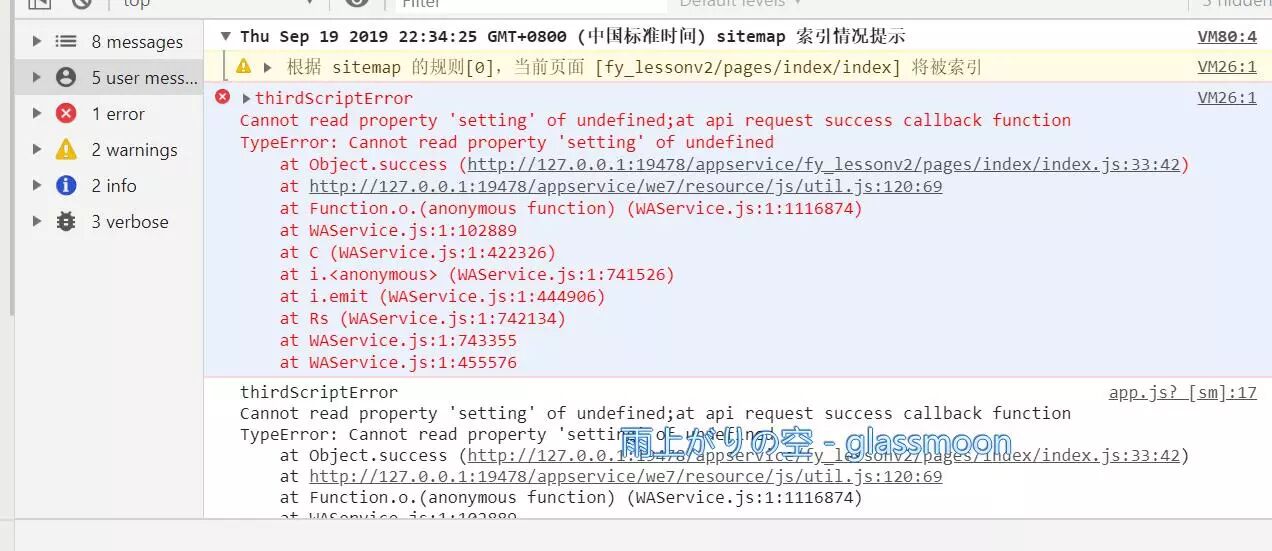 Cannot read property 'setting' of undefined;at api request success callback functionTypeError: Cannot read property 'setting' of undefinedat Object.success (weapp:///fy_lessonv2/pages/index/index.js:33:42)at weapp:///we7/resource/js/util.js:120:69at function.o.(anonymous function) (WAService.js:1:1123586)at yk (WAService.js:1:1083738)at Function.success (WAService.js:1:1085405)at WAService.js:1:102995at k (WAService.js:1:437200)at i.<anonymous> (WAService.js:1:704954)at i.emit (WAService.js:1:459831)at Bs (WAService.js:1:705562)在微信公众号后台里看到错误是这样提示