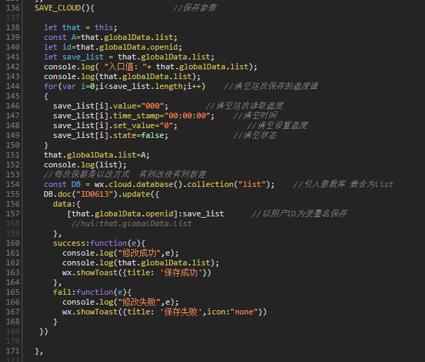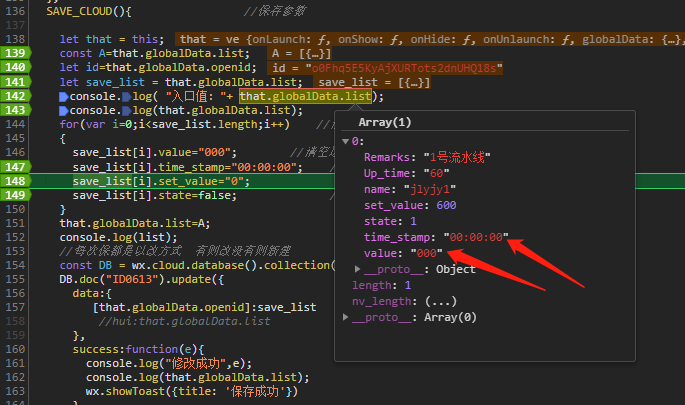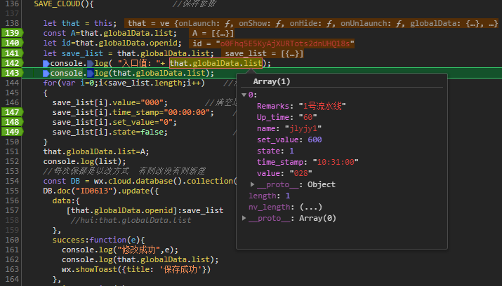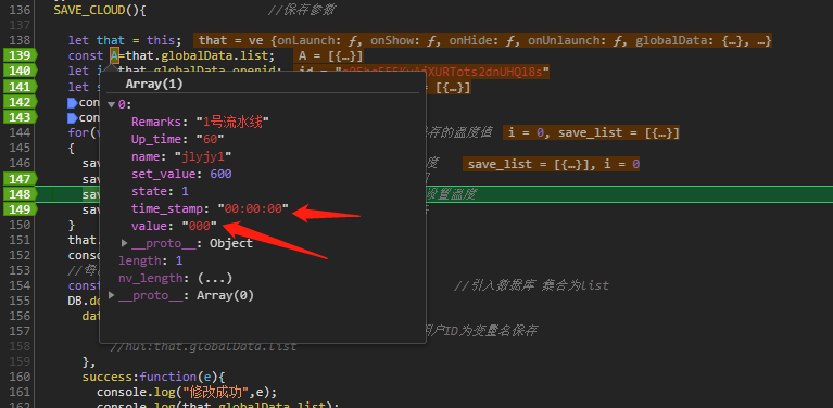 然后进入到下面数组清空就出问题了,这里我写的是读取后放到另一个数组里操作了,代码运行到148行,清空读取出来的 save_list 中的 value 和time_stamp,然后问题来了全局变量怎么跟着变了,更奇怪的是变量A也跟着变了。话说const的变量不是不能更改吗?