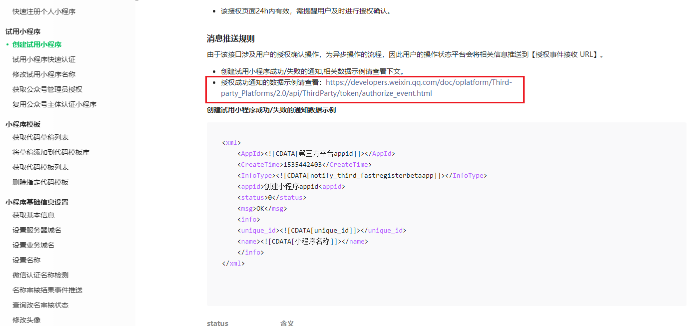创建试用小程序的时候,只收到了创建成功的消息推送,没有收到授权成功的消息推送。在创建试用小程序的Api中有授权消息的推送吗?