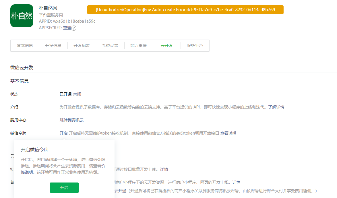 第三方开发平台,基本资料已经审核通过,开发信息也配置了。打算用云开发。在云开发那里开启微信令牌,结果失败。提示无权限。