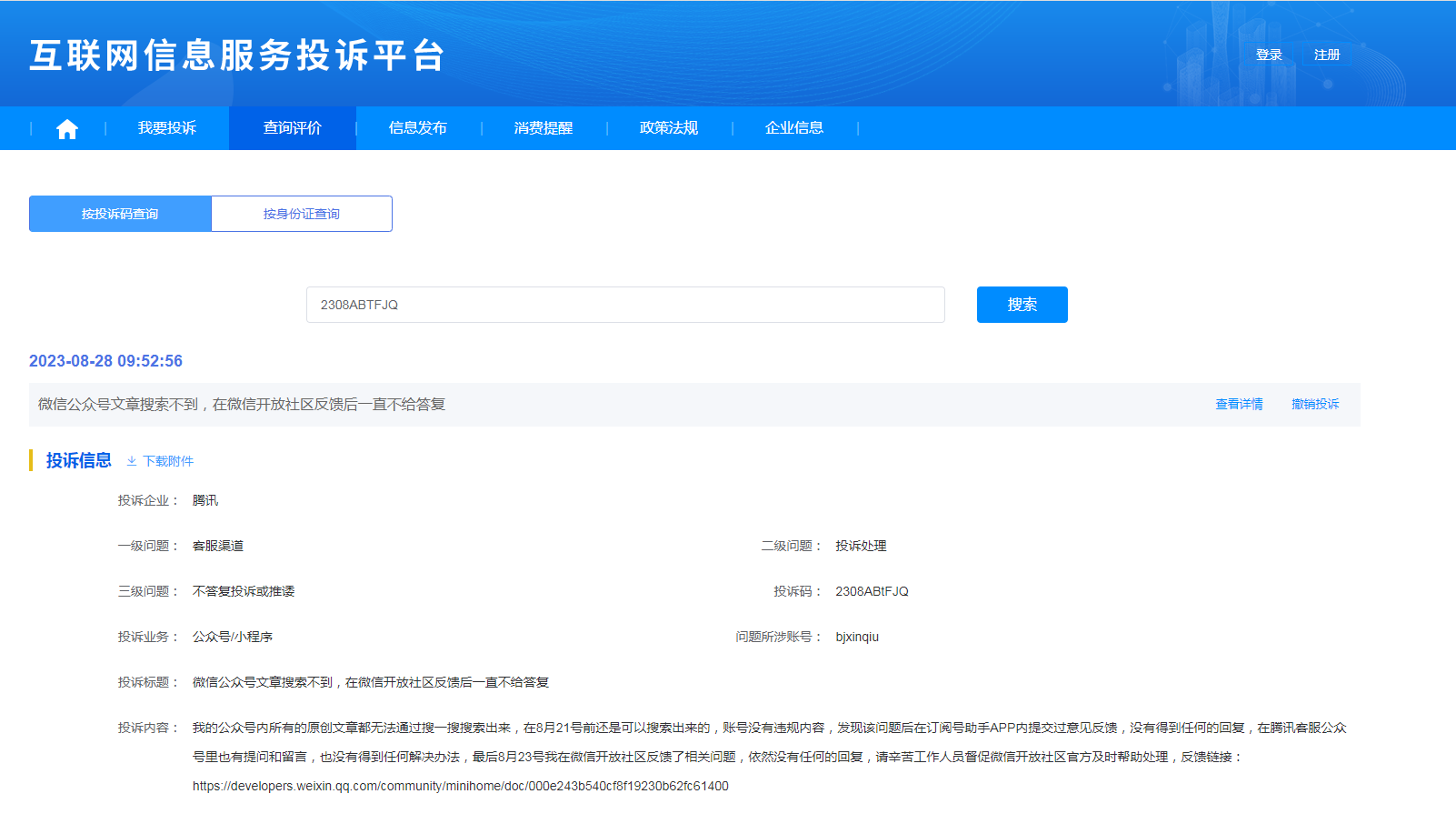 我在微信开放社区关注了好多天了,小程序、游戏、代码等官方回复的特别及时,但公众号文章搜索不到的问题他们根本就不回复,而且每天搜索不到的帖子非常多,开放社区的人就是视而不见,这种工作态度和响应速度真的不是腾讯该有的,很无语,因此我选择了互联网信息服务投诉平台,虽然我不知道能不能起到作用?多少人投诉能起作用?但是我还是投诉了,如果大家有需要的话可以去试试