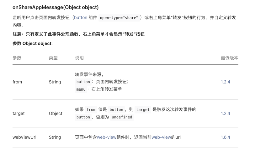 在页面js文件里面定义onShareAppMessage函数,右上角菜单才会显示“转发”按钮:https://developers.weixin.qq.com/miniprogram/dev/reference/api/Page.html#onShareAppMessage-Object-object
