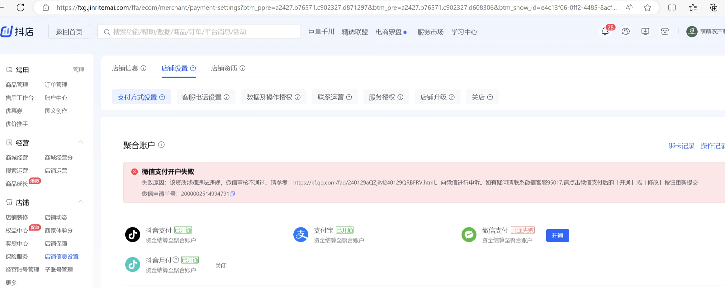 资质涉嫌违法违规,入驻的时候提交的资质就营业执照、法人身份证等,所以1、可以先查下这个主体有没有风控的商户号,要解除了再尝试开通。2、如主体底下没有风控的商户号,就是法人关联风控,可以换个法人试下。