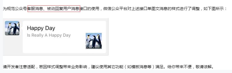 开发者你好。 为规范公众号客服消息、被动回复用户消息接口的使用,微信公众平台对上述接口单图文消息的样式进行了调整,如下图所示: