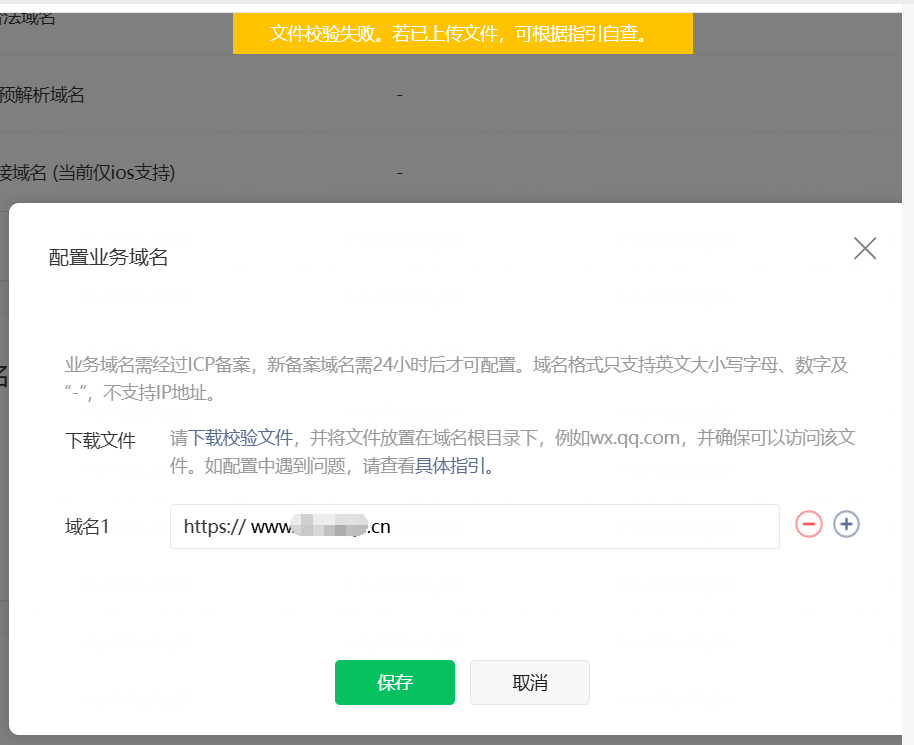 微信小程序业务域名配置,提示“文件校验失败。若已上传文件,可根据指引自查。”,再点击保存的时候提示“系统错误,请稍后再试”。下载的校验文件和校验文件内容是一样的。后台校验文件是放在根目录下的,而且浏览器能直接访问到文件。是哪儿的问题呢?