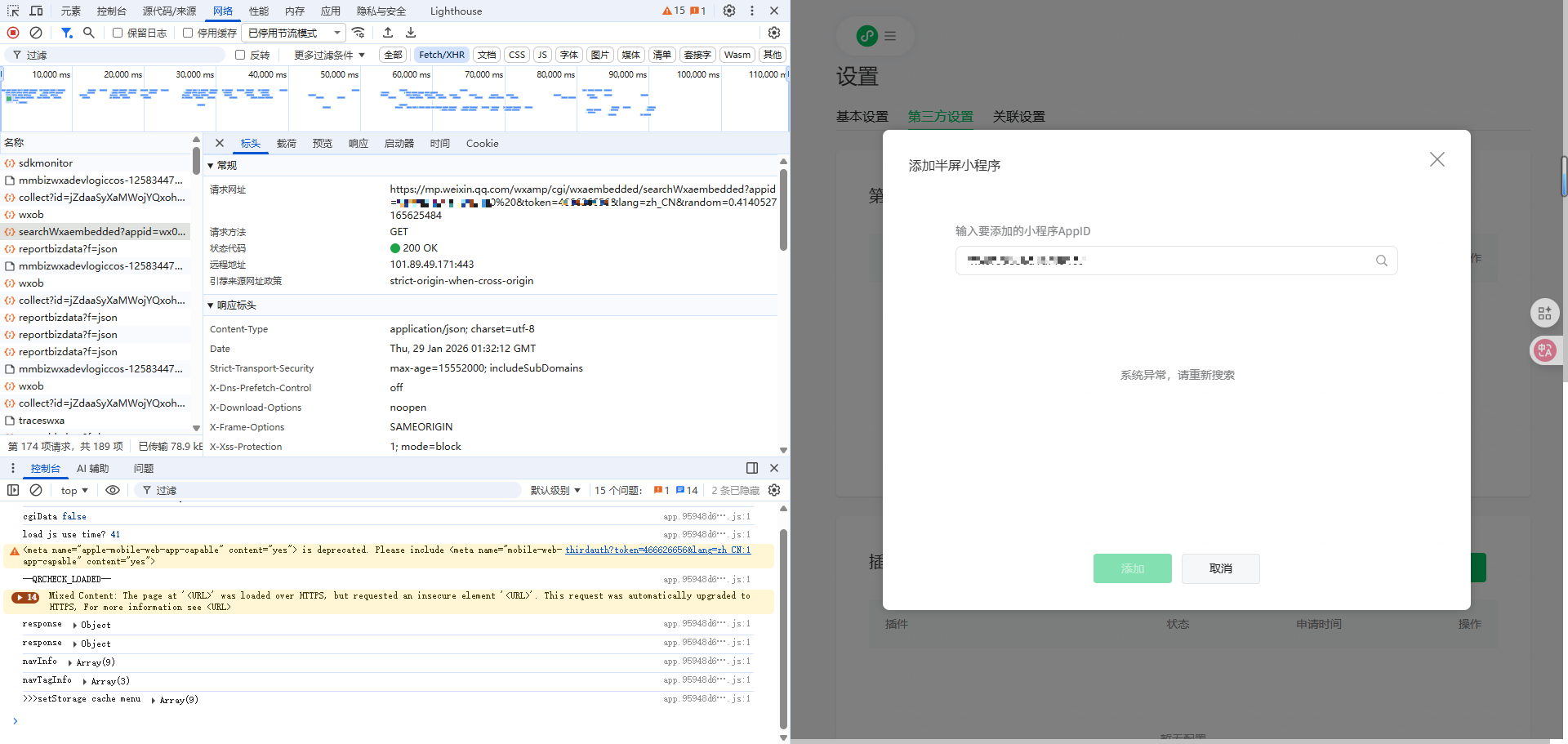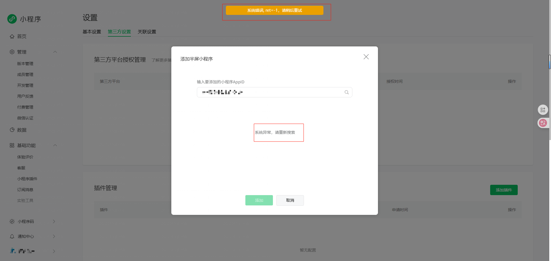 添加半屏小程序时,搜索对方小程序APPId,提示系统异常,请重新搜索,搜索几次都返回当前情况