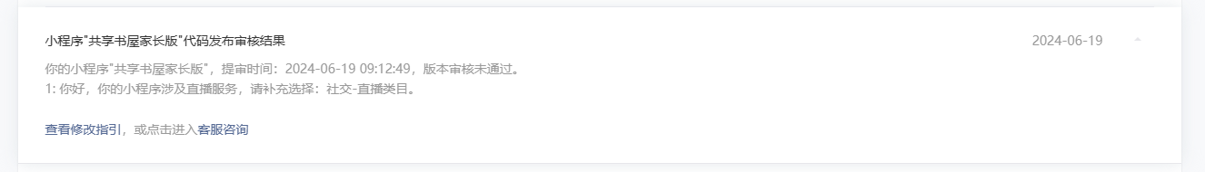 2.小程序涉及直播服务,建议补充选择【社交-直播】类目。或自查代码,确保包括前端展示、小程序代码等整体均移除上述内容,再提交代码。小程序类目适用范围及其资质详情:https://developers.weixin.qq.com/miniprogram/product/material/