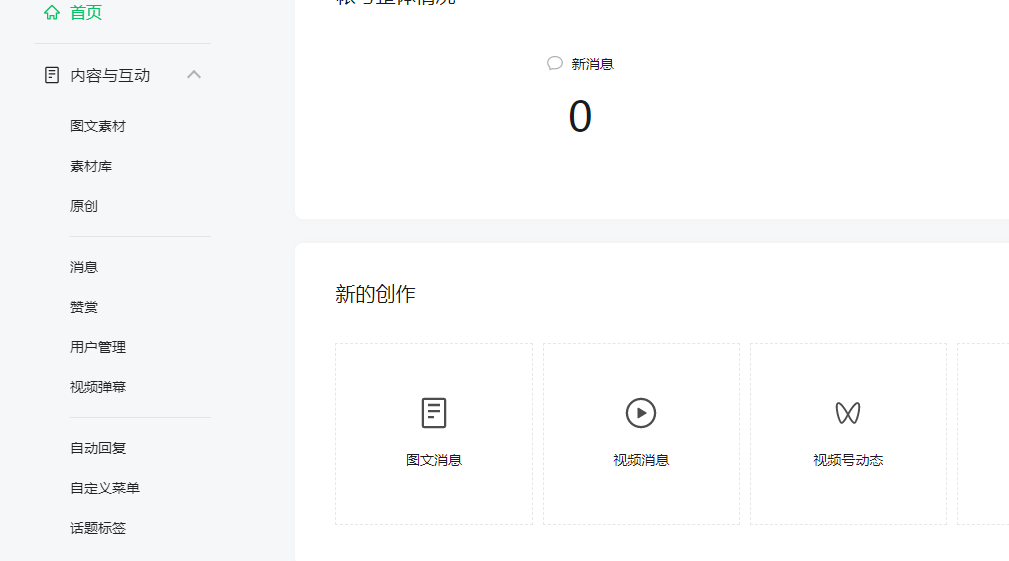 如图所示,公众号后台并没有升级后的草稿箱功能和发布选项,导致现在想做页面模板却没办法搭建,但是登录另一个公众号看到的页面又是升级后的,发布和草稿箱功能也都正常
