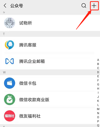 在通讯录添加公众号,点击+号搜索公众号名称搜索不到。