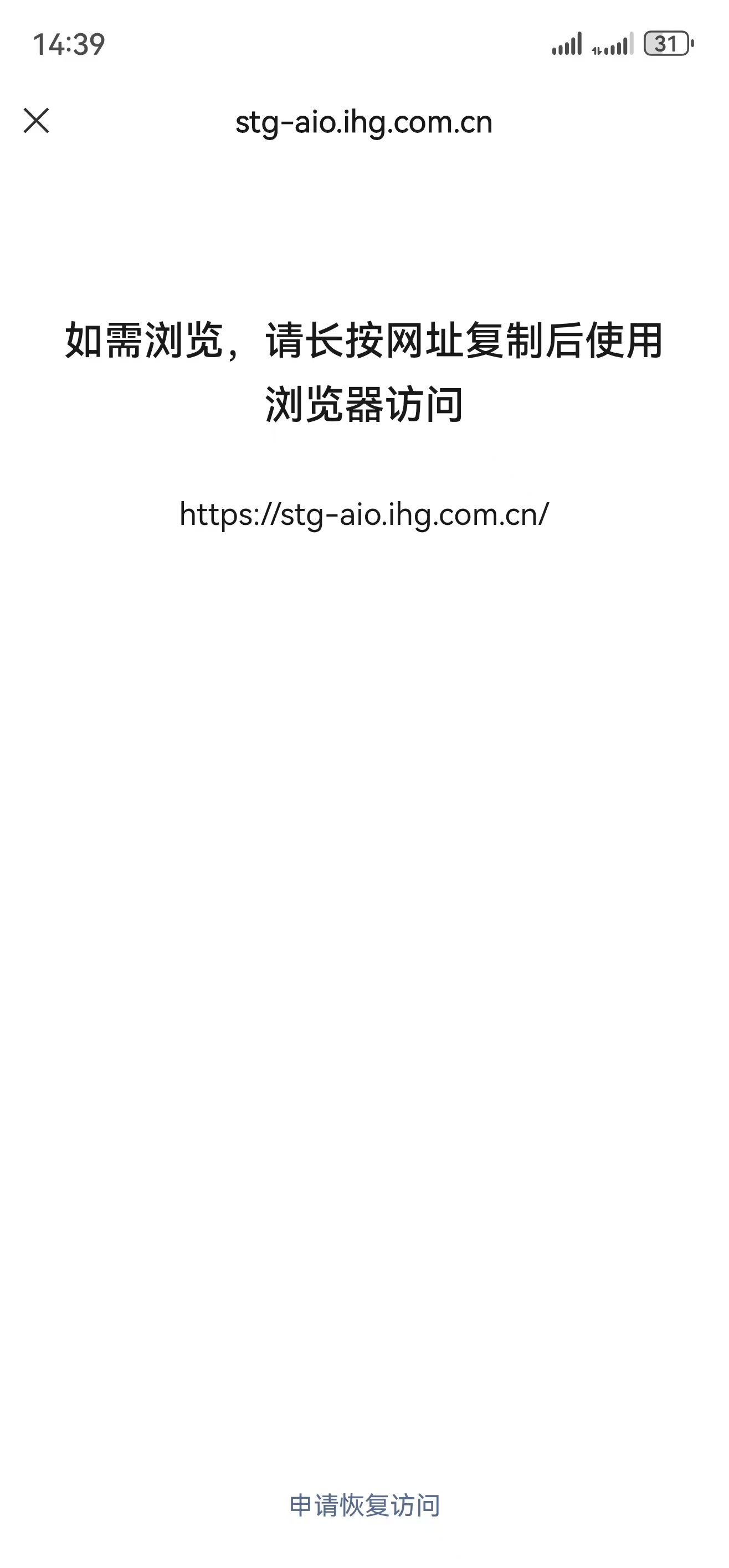 你好,stg-aio.ihg.com.cn,域名备案正常,但是网址都被限制访问, 希望解除限制 ,已经提起申诉,想了解具体原因是什么呢?