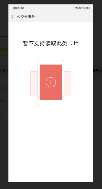 当卡片放到手机后面的时候,就直接跳转到了这个页面。不知道是NFC接口不支持卡片还是只是因为BUG直接跳转到了该页面。