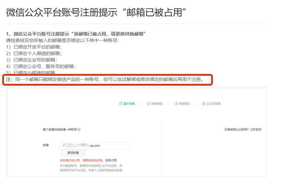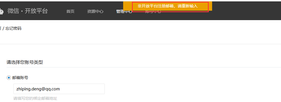 不是bug, 邮箱被其他应用占用了,注册微信开放平台只能用新邮箱