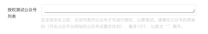 在全网发布之前,仅该列表内公众号才可进行授权,以便测试。请填写公众号的原始ID(可在公众平台网站的公众号设置页找到),最多10个,以英文“;”隔开。
