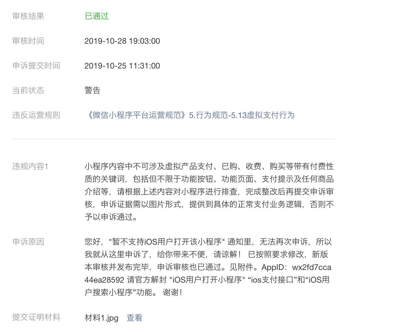 现在我们又一次将所有带有" 购买,已购"等字样的文字全部去掉了后,提交发布,并且申诉也得到了 "已通过" 的回复。可是还是没有解封啊?