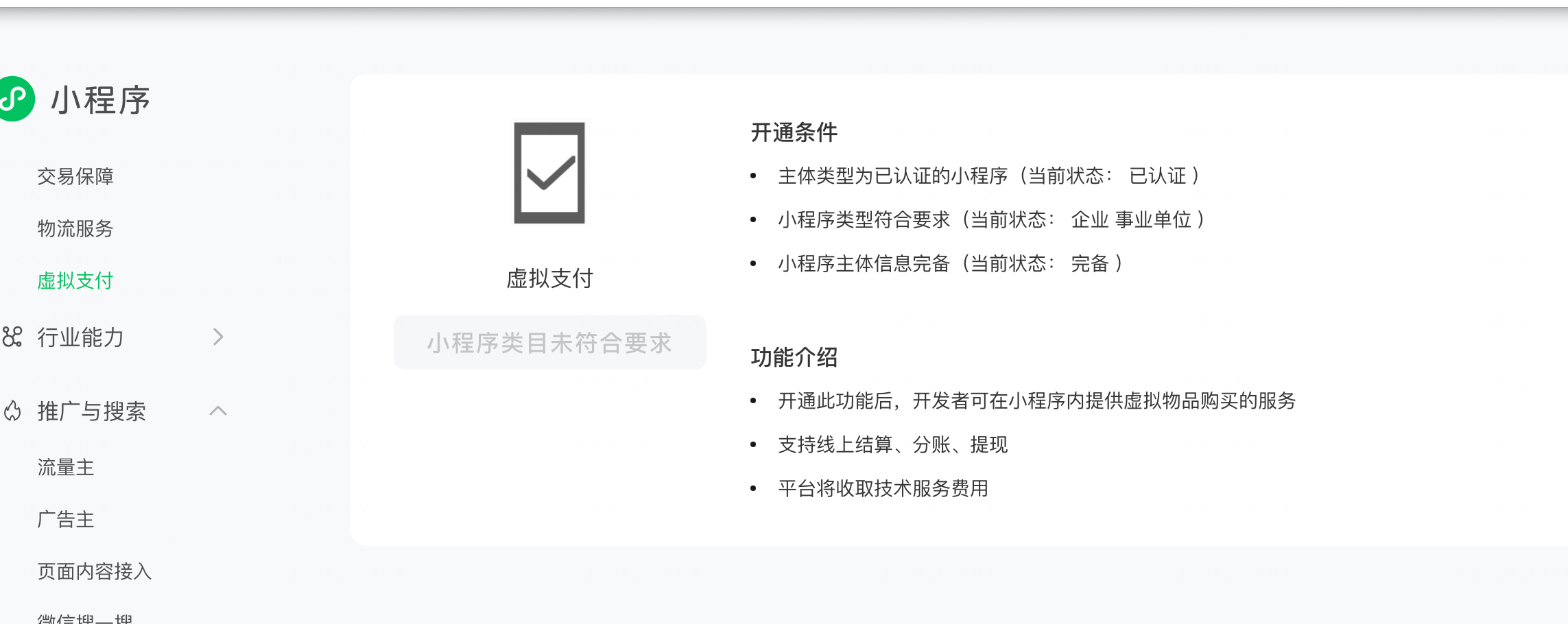 我们想接入IOS虚拟支付,但是显示小程序类目未符合要求,请问一下:哪些小程序类目属于虚拟支付?怎么查看自己可以 接入哪些类目达到要求?
