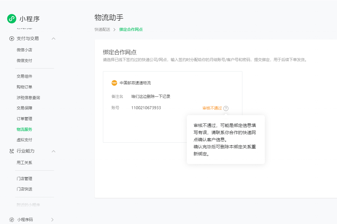 解绑邮政速度,然后重新绑定审核通过不了,提示能是绑定信息填写有误,请联系你合作的快递网点确认客户信息。