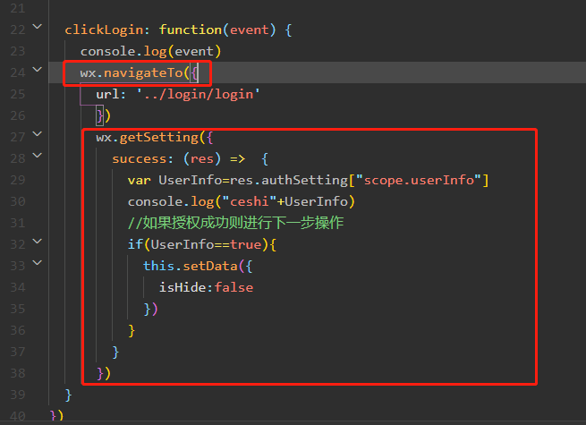 如图代码,我想在跳转授权页面之后。再执行wx.getSetting()方法监测授权是否成功,如果成功就改变<view>标签的视图渲染
