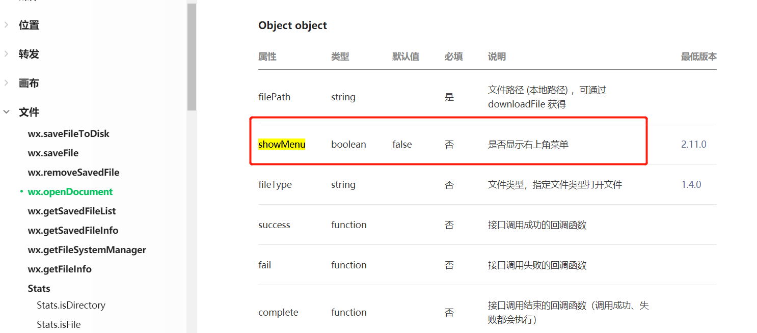 wx.openDocument(OBJECT)新开页面打开文档,支持格式:doc, xls, ppt, pdf, docx, xlsx, pptx。