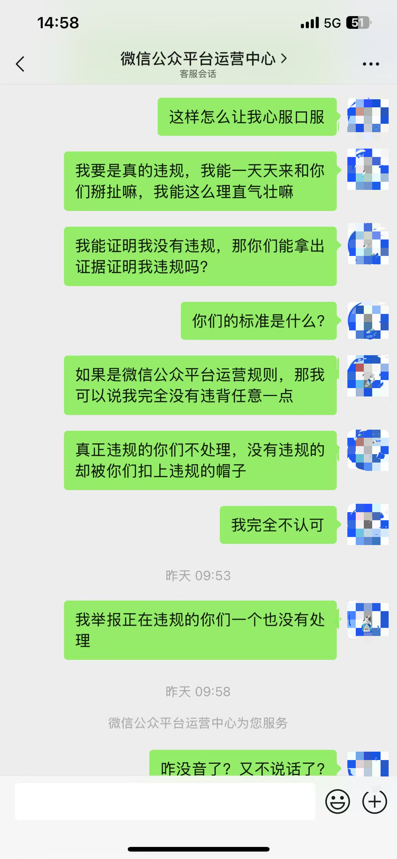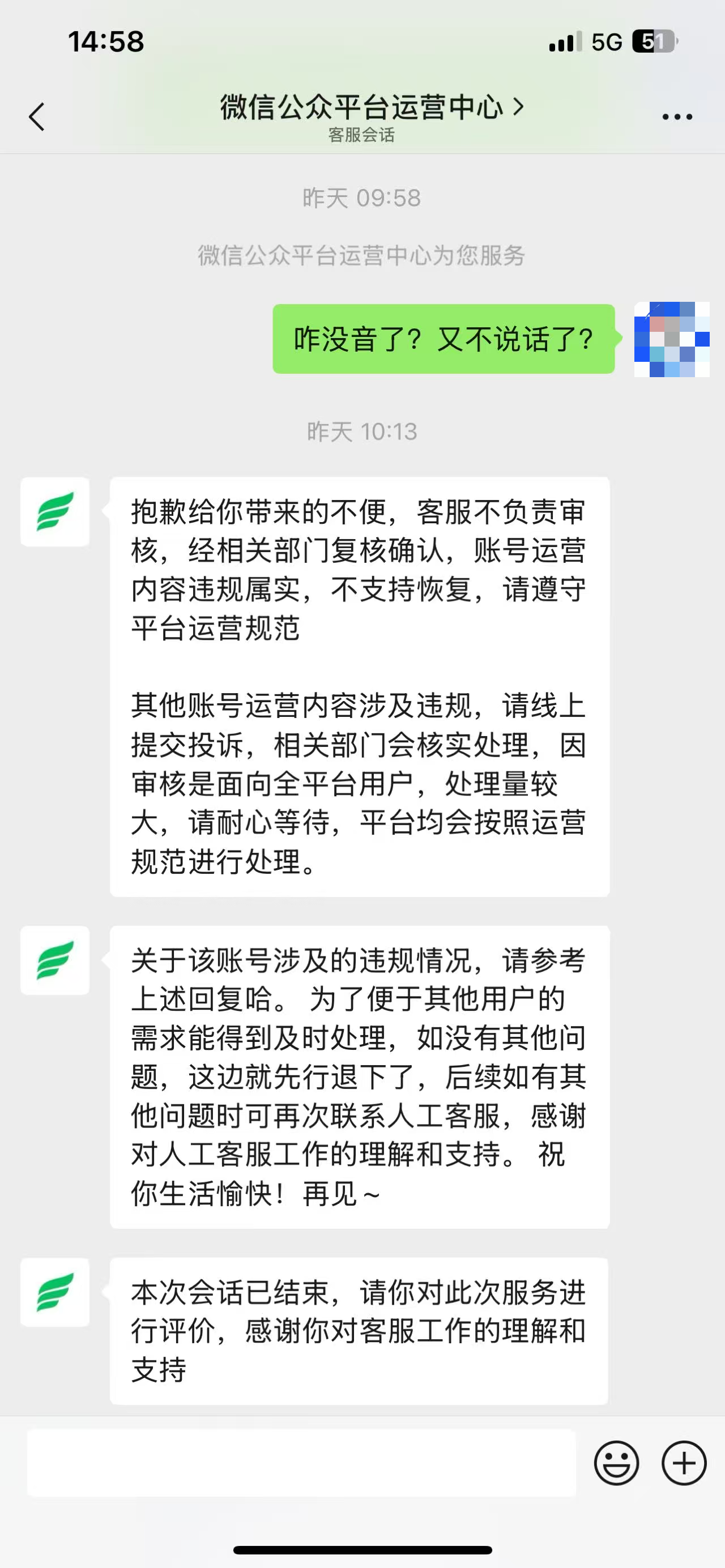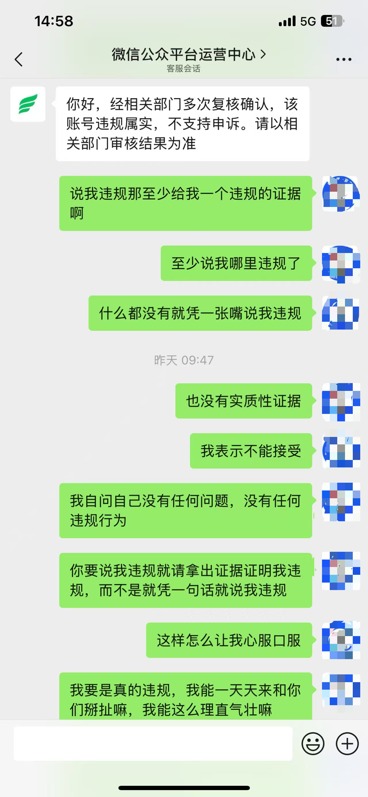 公众号的审核你既然说我的账号违规,为什么不敢拿出证据,说我违规缺没有任何证据来证明我违规,客服全程敷衍,不说话,甚至提前结束对话。这就是你们的服务态度,这就是你们为用户解决问题的态度,说我账号违规,我要个证据合情合理吧。根据《民典法》我是有权知道我账号违规的原因、违规的依据以及违规证据的。