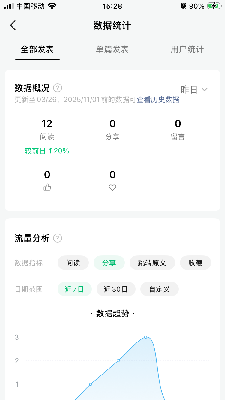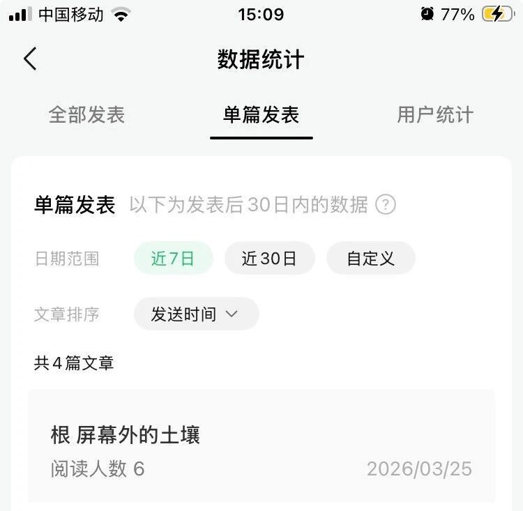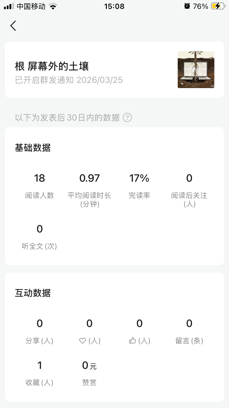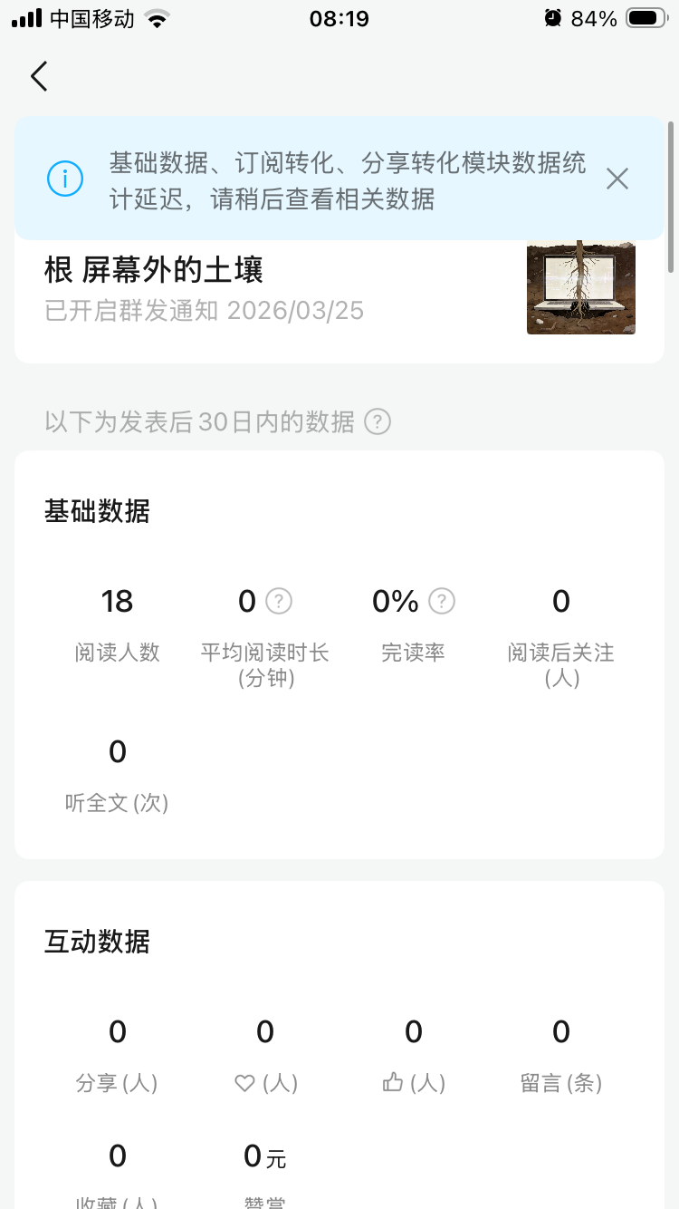 我要问的不是这个问题,是该篇文章的后台数据全是0,比如说平均阅读时长、完读率等,数据延迟了两天还一直不出现,到底是怎么回事?