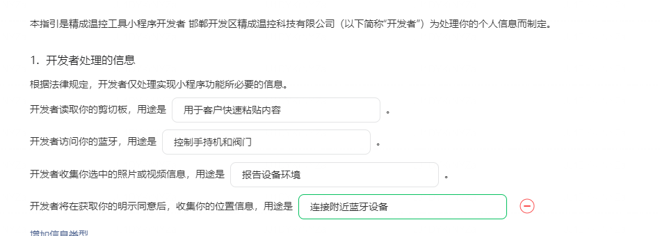 你好,你的小程序【联系方式】涉及收集、使用和存储用户信息,请补充增加或完善《用户服务协议》及《隐私政策》,明确告知收集用户信息的使用目的、方式和用途 ,并取得用户授权同意后,才能获取用户收集用户信息。