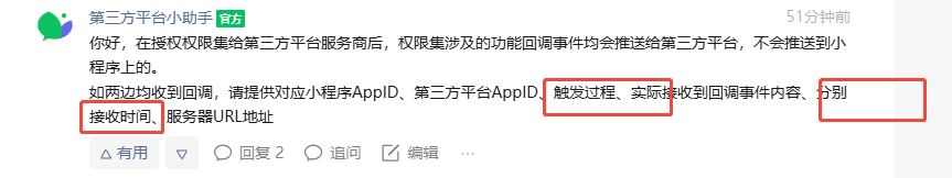 如两边均收到回调,请提供对应小程序AppID、第三方平台AppID、触发过程、实际接收到回调事件内容、分别接收时间、服务器URL地址