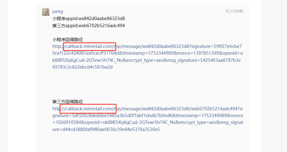 http://callback.minretail.com/mp/message/wx842d0aabe86323d8?signature=59ff27e6cbe70cef122c424081ee0cecff31764d×tamp=1753344989&nonce=1397851399&openid=ok88R5Xq6gCud-2GTvwr5h74C_Ns&encrypt_type=aes&msg_signature=5425403aa8787b3e69783c3c622ebcd4c581ba2d