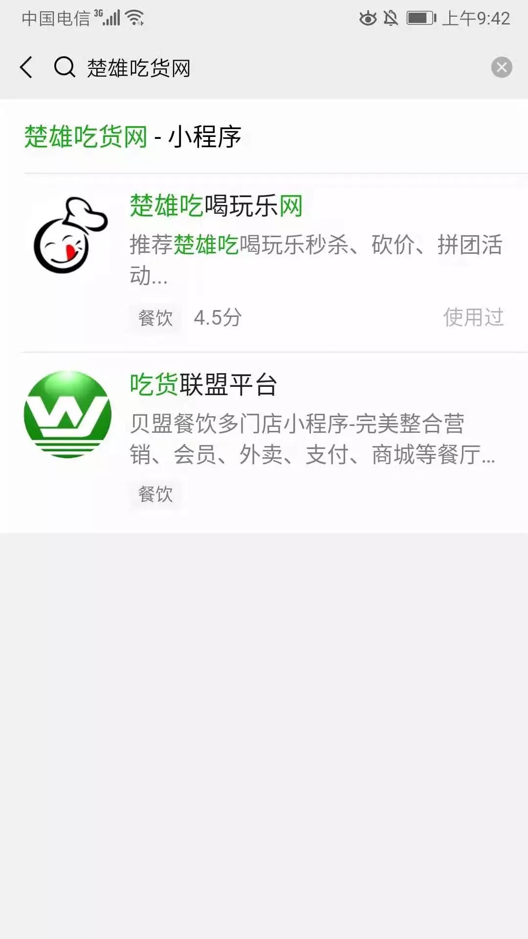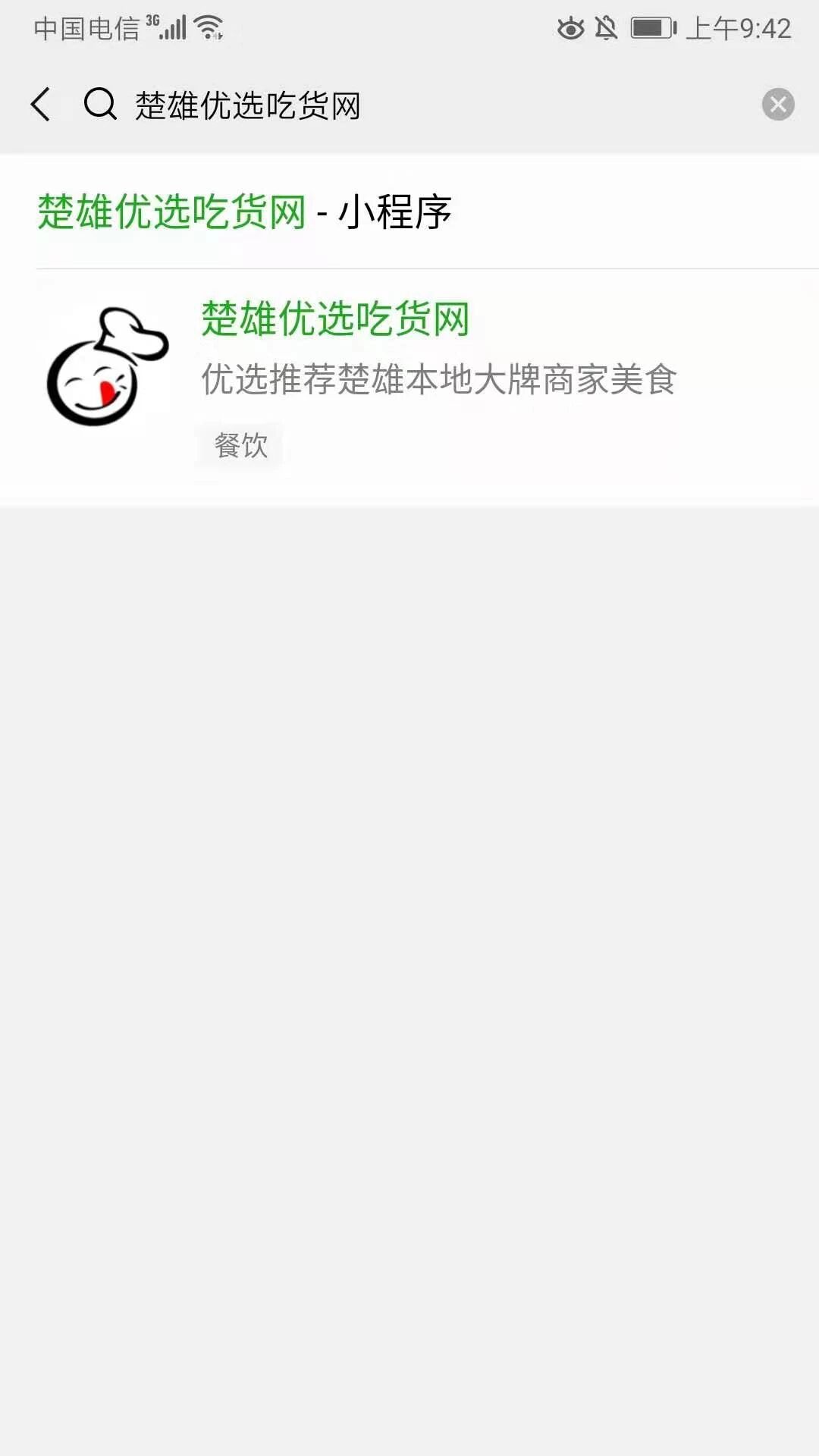 2、输入全称小程序名称“楚雄优选吃货网”,可以搜索到小程序
