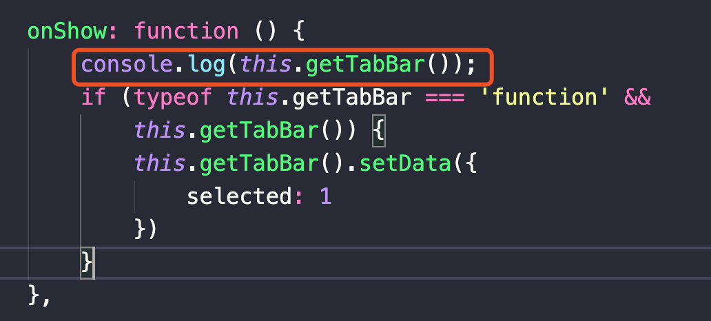 使用自定义tabbar,在使用的时候,发现菜单点击会发生错乱,于是上网查了相关信息,发现是因为没有在每个tab页面中添加this.getTabBar()这一段代码,于是就加上了这段代码。如下: