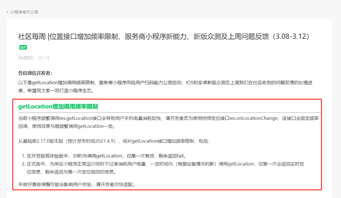 官方新增了调用频率限制,开发者需要完善下业务逻辑。比如利用缓存等方法减少调用频率,并完善调用失败后的业务逻辑,比如可以让用户手动选择定位等。