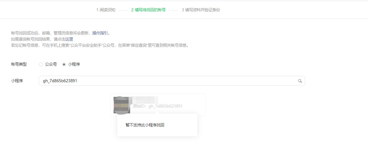尝试找回账号,但是却提示【暂不支持此小程序找回】忘记了这个小程序的注册邮箱了,当时就是随便一注册,应该没,小程序原始ID: gh_7d865b623891,希望帮忙找回下