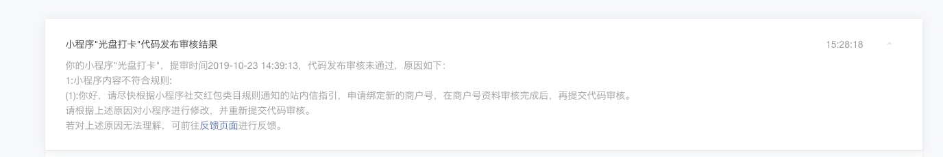 我司小程序(APPID:wx6a4976bd627fc4ca)在提交版本时收到如下反馈:
