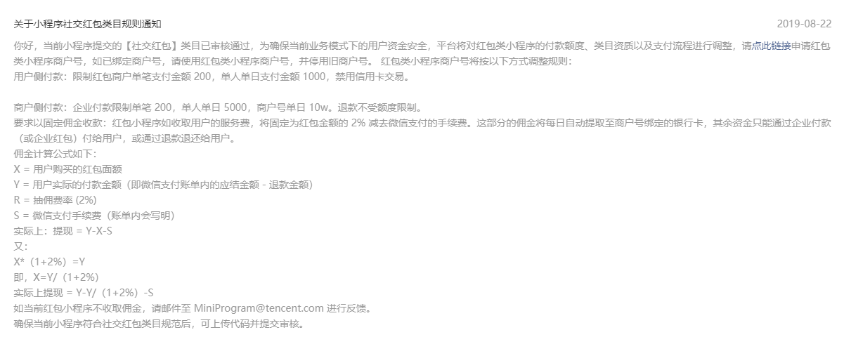 需要说明的是,我司的卡小程序没有用户充值红包和红包广场等功能,用户只有平台发放的奖励金、并可以提现到零钱,但用户彼此之间不存在发放红包的行为,平台也不收取相关佣金。鉴于此,能否申请撤回社交红包类目,或不抽取2%抽佣费率。