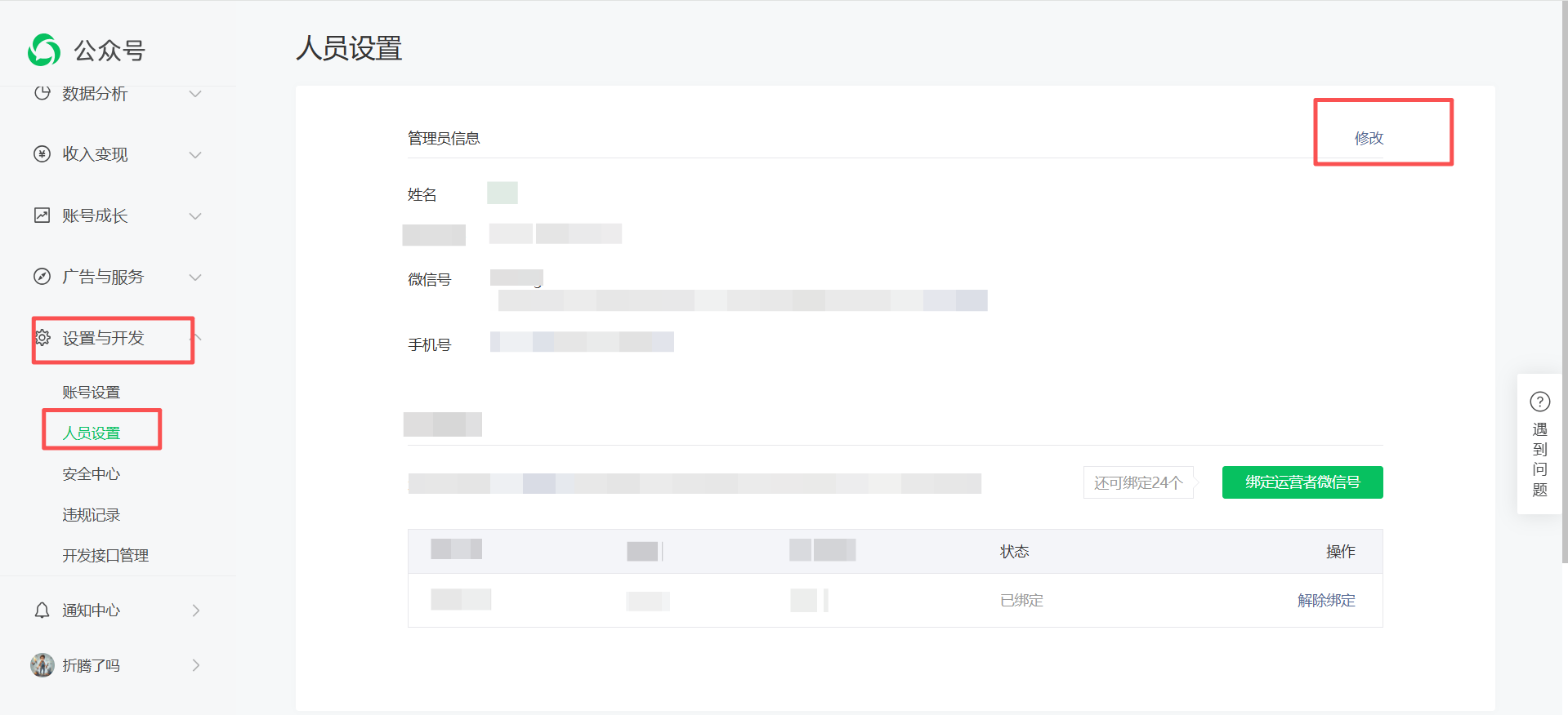 登录公众号后台https://mp.weixin.qq.com找到设置与开发-人员设置