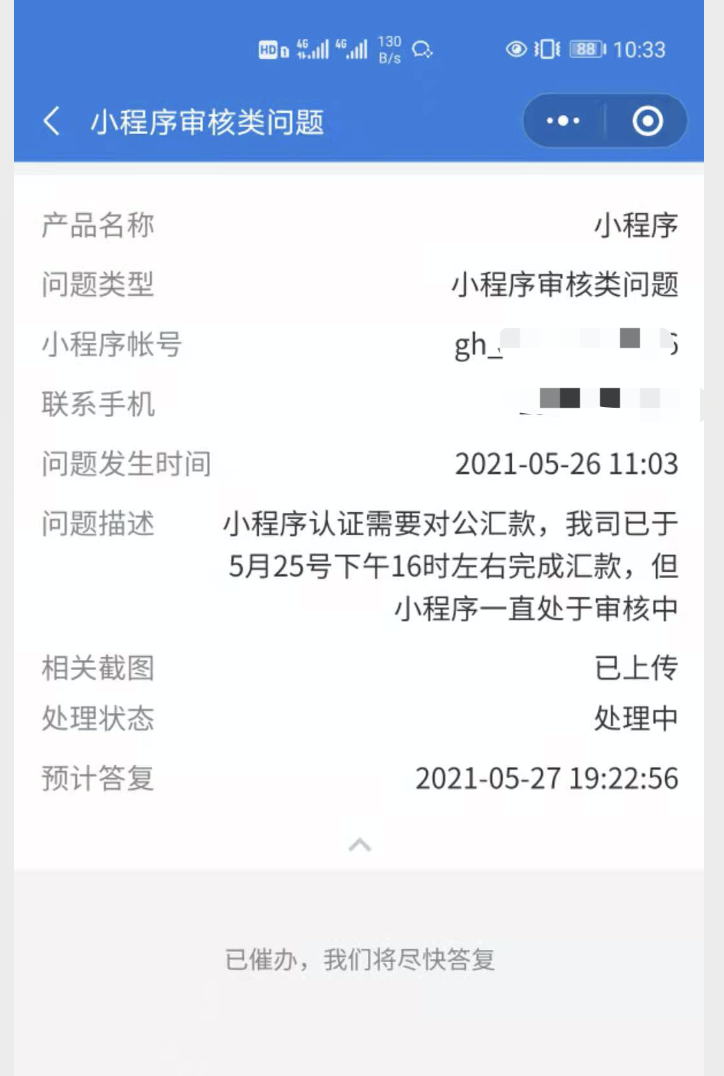 您好,我司小程序在认证时卡在对公汇款阶段,于5月25号进行对公汇款,目前进度一直卡在这里,腾讯客服哪里在5月26号也进行申请了,但是一直显示处理中,请帮忙查看下什么情况
