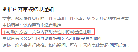 昨天刚发的内容,上午进行助推,结果提示审核不通过,理由为:文章内容时效性即将或已经过期。(如下图)