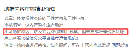 上午重新把文章发了一遍,把带有时间字眼的内容进行了调整,再次助推,结果提示涉及专业/权威知识分享,但未完成账号资质认证。(如下图)