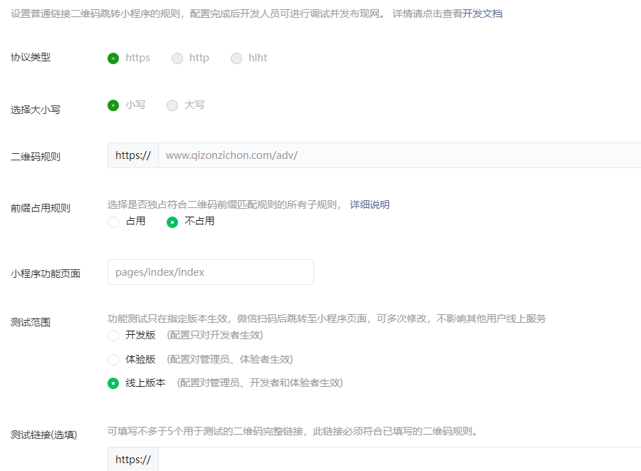 3、二维码链接是否属于配置规则的子路径(需以/结尾才支持子路径匹配)(二维码链接是:https://www.qizonzichon.com/adv/pages/index/index?id=143);