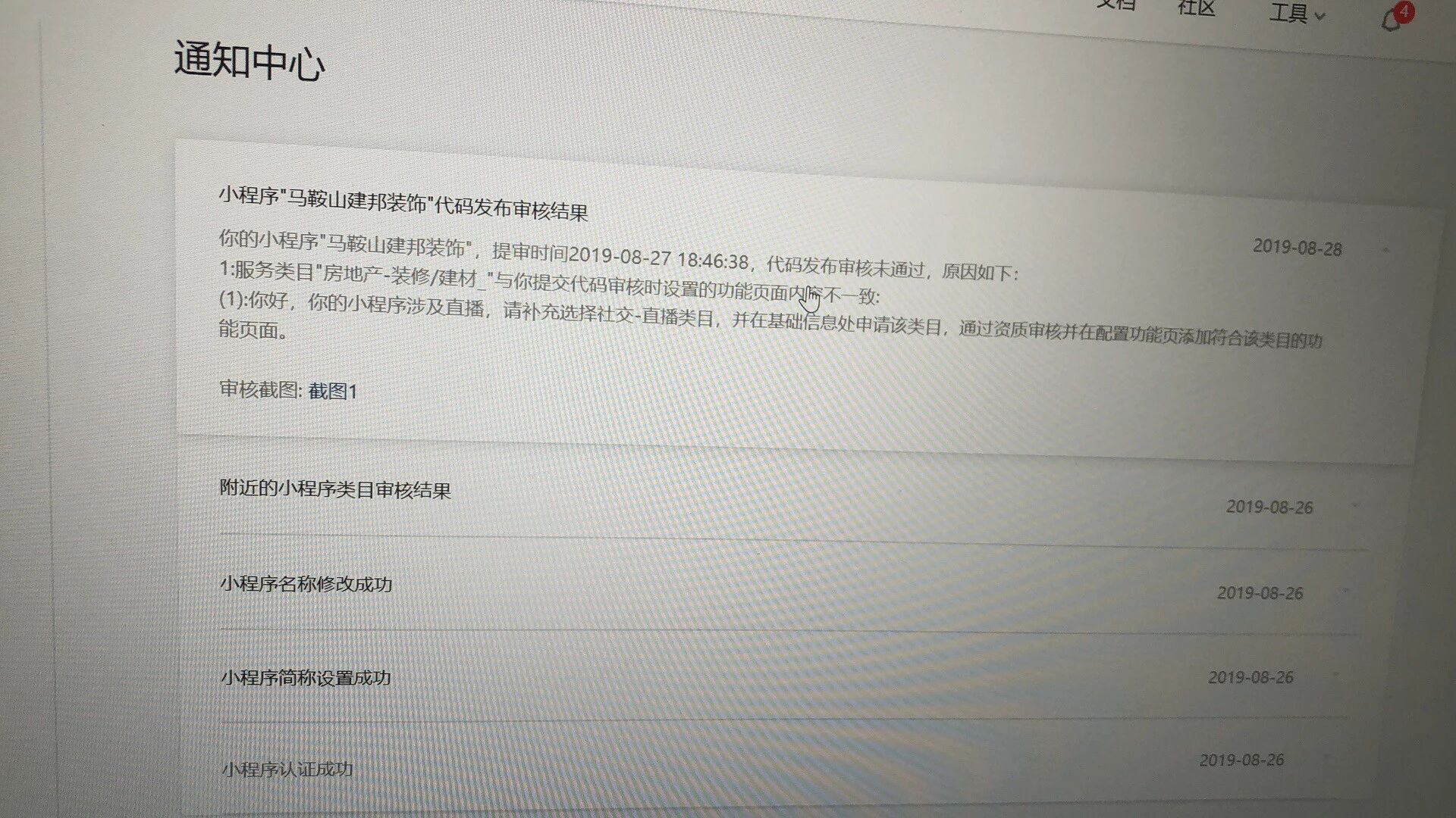 问题描述:“马鞍山建邦装饰”为装修行业,小程序属于装修类小程序,页面出现的“直播”字样,为工地施工过程的内容记录,并非社交类直播,请核实后重新审核,谢谢
