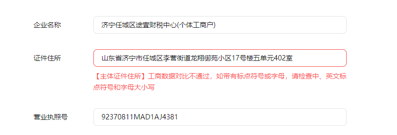 【主体证件住所】工商数据对比不通过,如带有标点符号或字母,请检查中、英文标点符号和字母大小写