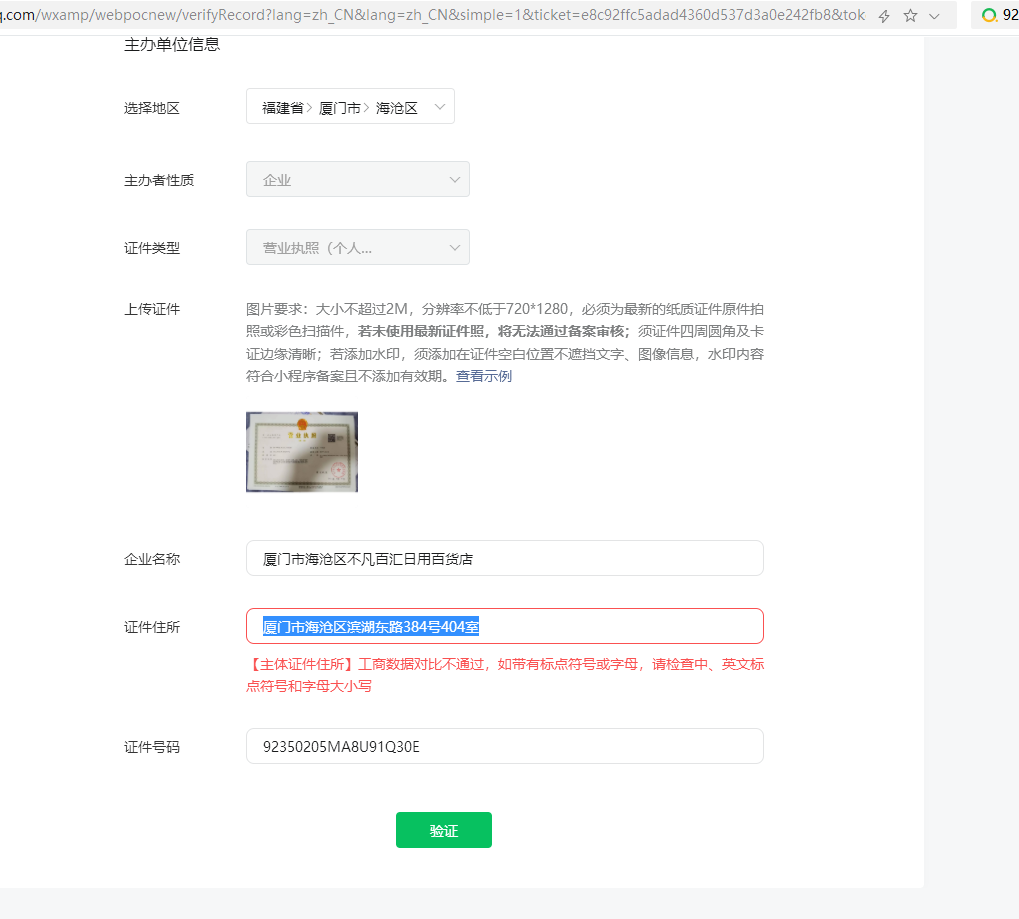 【主体证件佳所】工商数据对比不通过,如带有标点符号或字母,请检查中、英文标点符号和字母大小写、