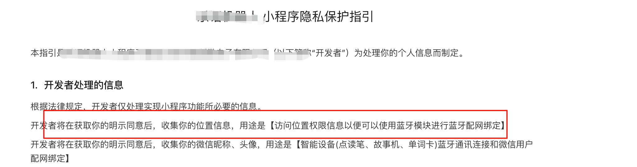 完善用户隐私保护指引,一直审核失败,小程序需要访问蓝牙,然后在Android机型上访问蓝牙需要授权地理位置权限,所以我在地理位置这栏如下描述有何错误??