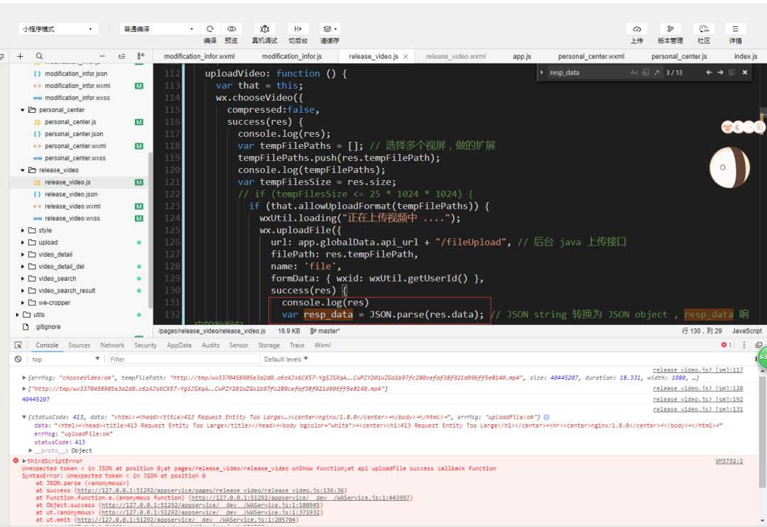 可是我上传一个30多M的视屏就会报错,上传十几M的就没有报错