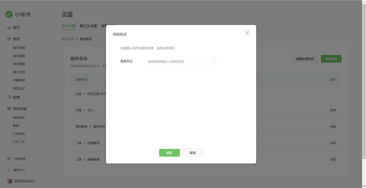 5、选择对应需要添加的服务类目,部分类目需上传对应资质文件,上传成功后点击确定即可提交成功,等待审核通过即可添加成功。部分无需资质的类目不用审核可直接添加成功。类目加急流程可参考:https://developers.weixin.qq.com/community/develop/doc/00060c51ed8448a6002cff96659401?blockType=1