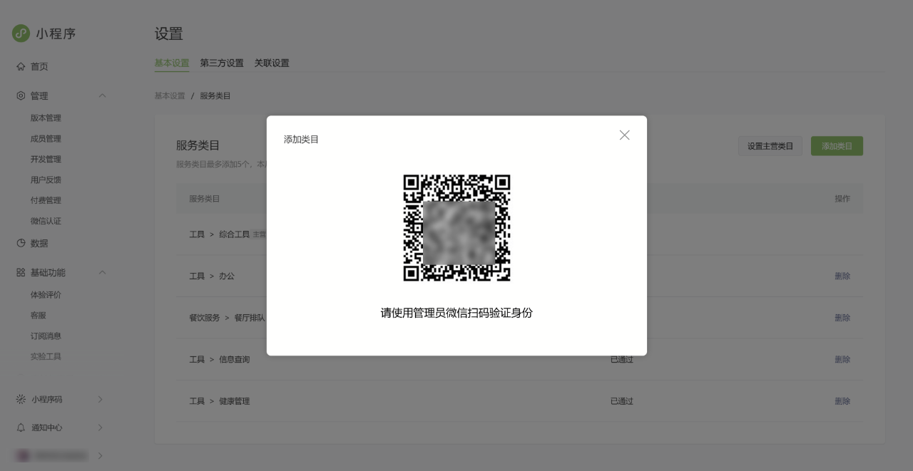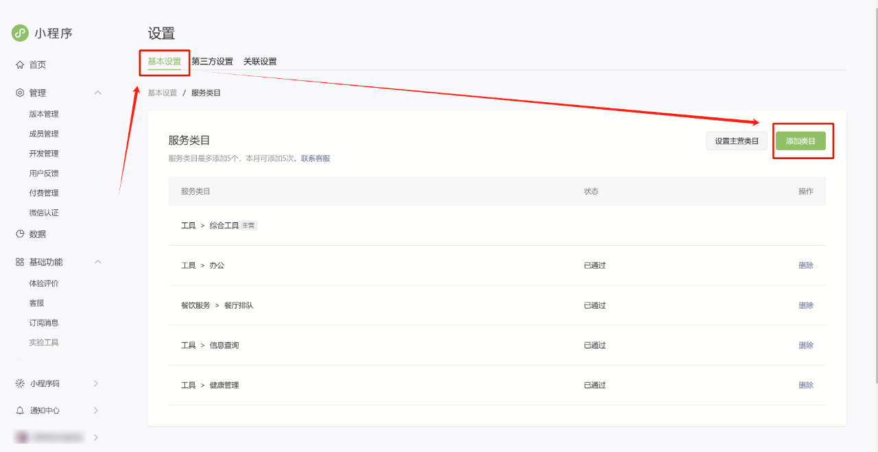1、登录小程序管理后台-左下角账号icon-账号设置-基础设置-服务类目-点击「详情」