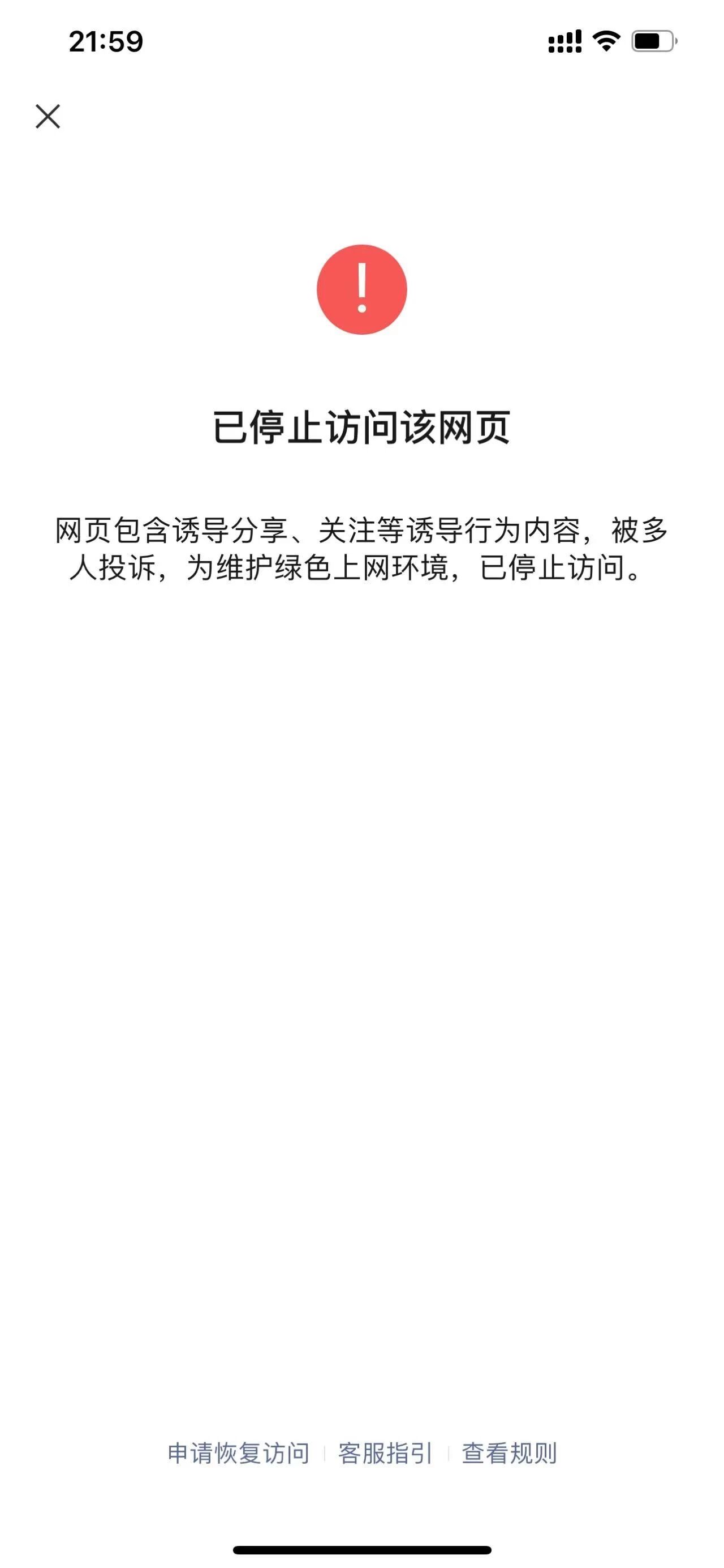 你好,经审核,域名jk69.cn下的链接:【http://jk69.cn/?cy=a44a8WVYNoA3Ez3s5rvpMtNw62kipGuUvxFvWXaFqN1cWiih&ppt=cc#】的内容违反《微信外部链接内容管理规范》的第19条“恶意对抗类内容”,不予恢复微信内直接访问的服务,请知悉。