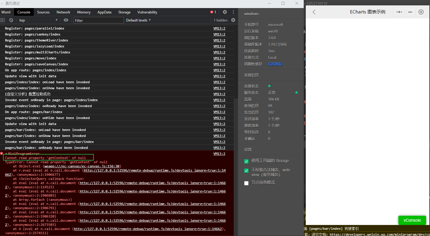 但是在真机调试时,启用PC端自动真机调试在进入某个图的响应界面会报错''Cannot read property 'getContext' of null'':