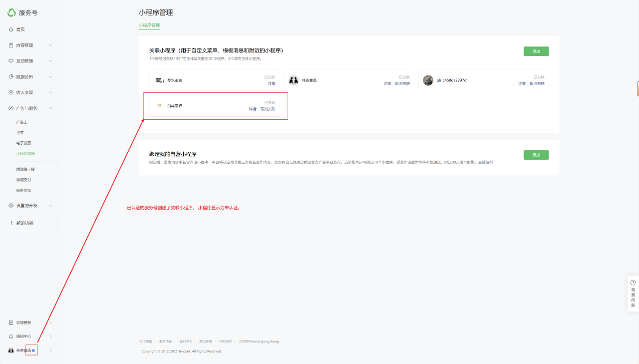 已经完成注册的小程序需要单独年审。与是否关联无关。