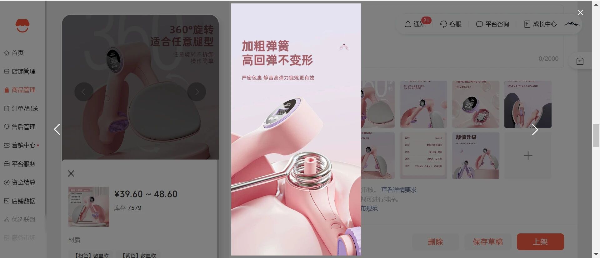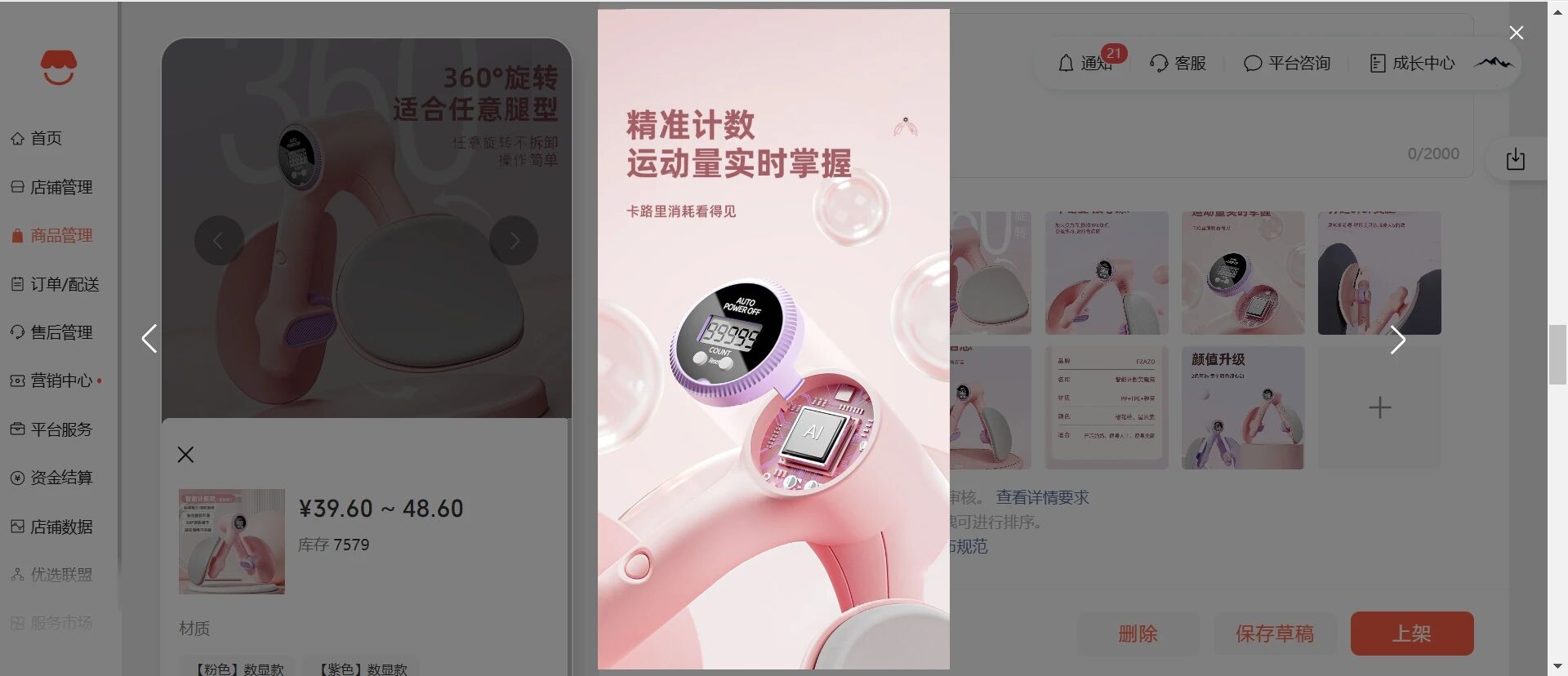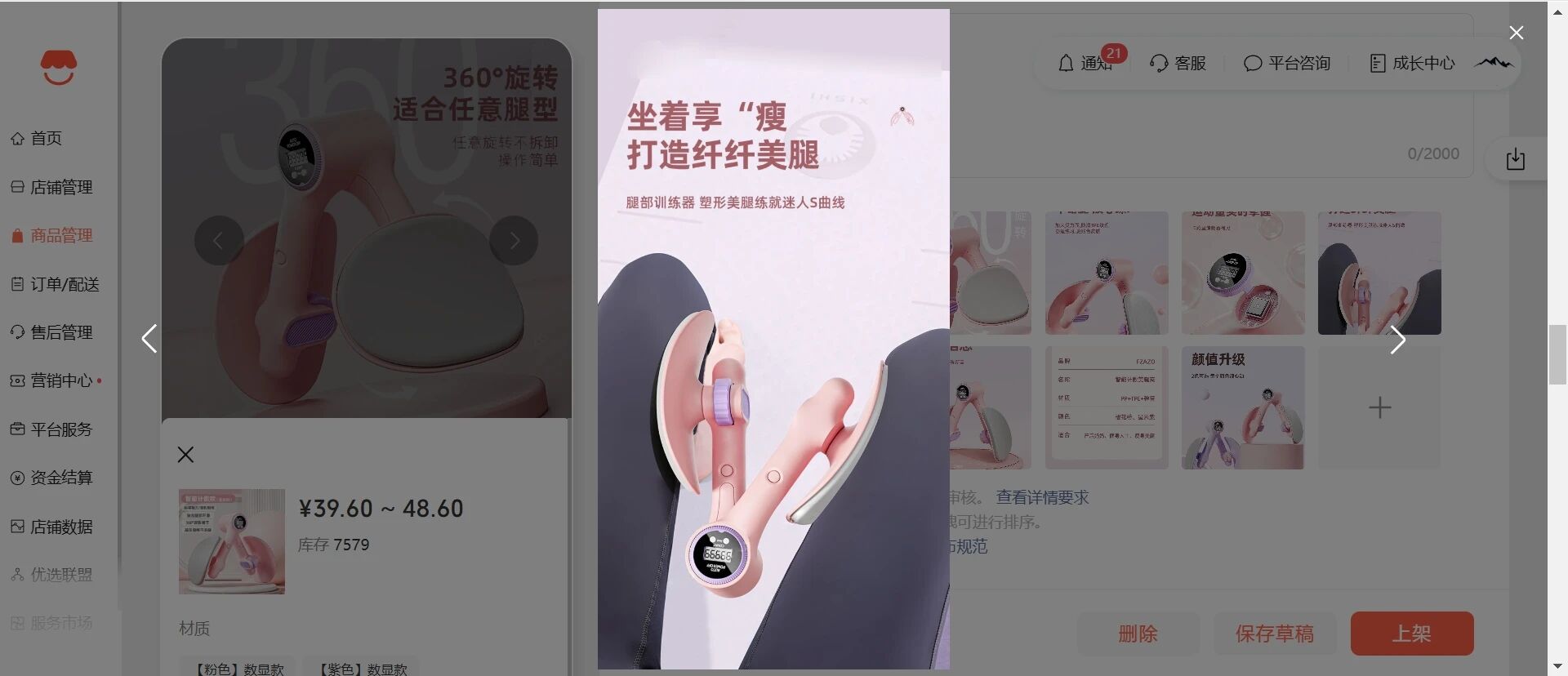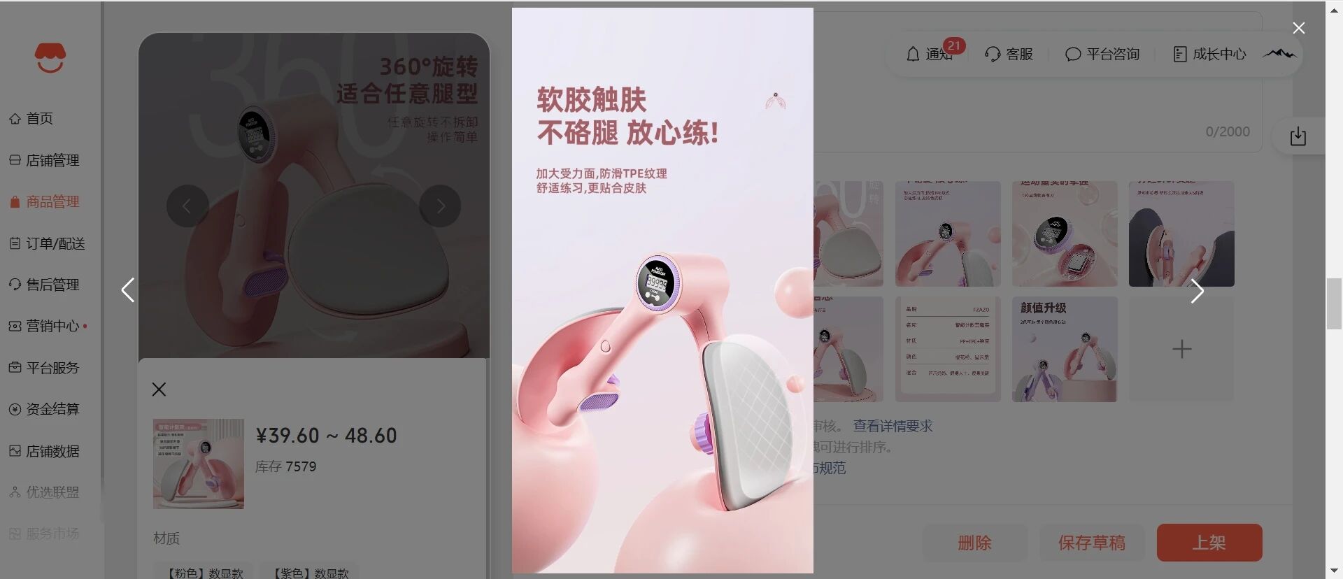 上了一个美腿器的品,审核一直以涉及医疗功效不给通过,具体的图片我放出来,请问是哪里存在医疗功效了?客服说的都修改过了,还是没有通过,最后说失败多次违反平台规则不给通过,一个上午就提交了两个品,一直耗在上面,能否改进一下