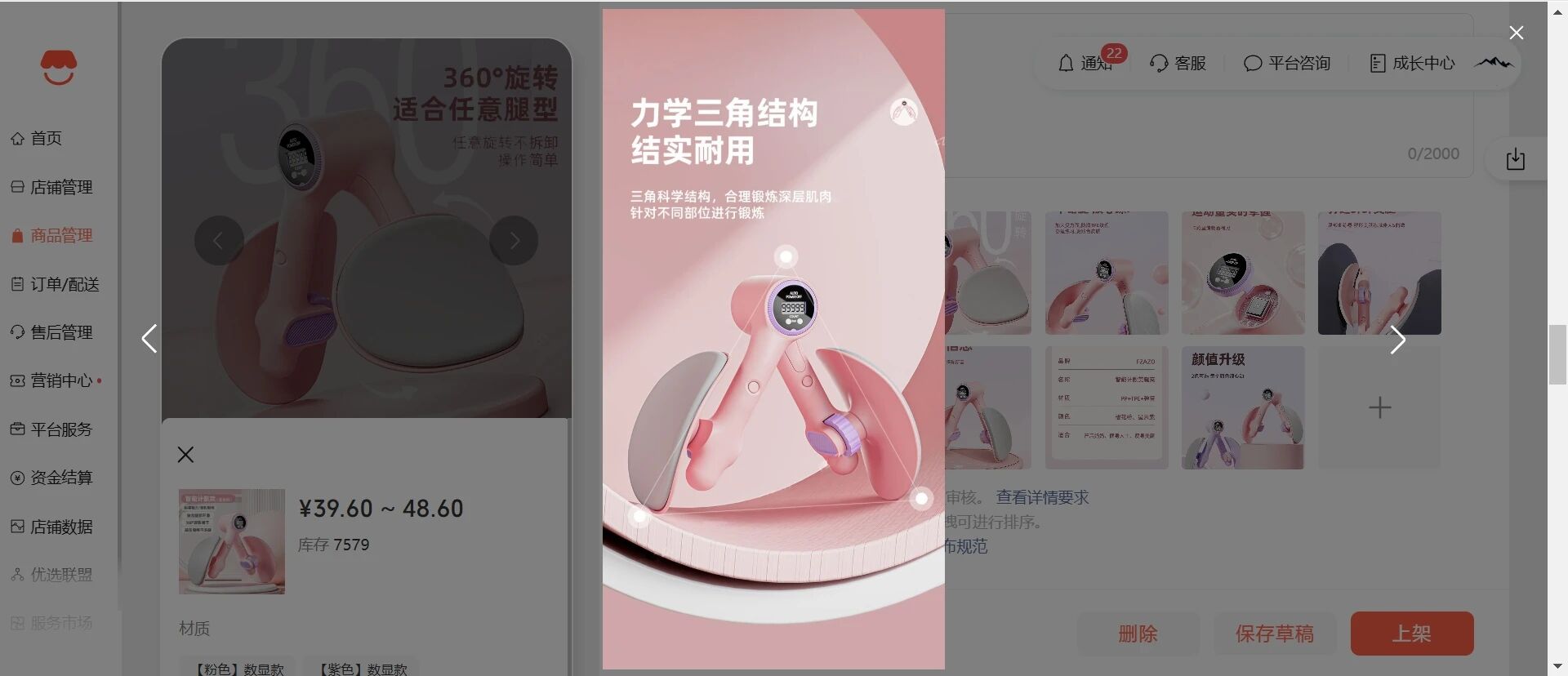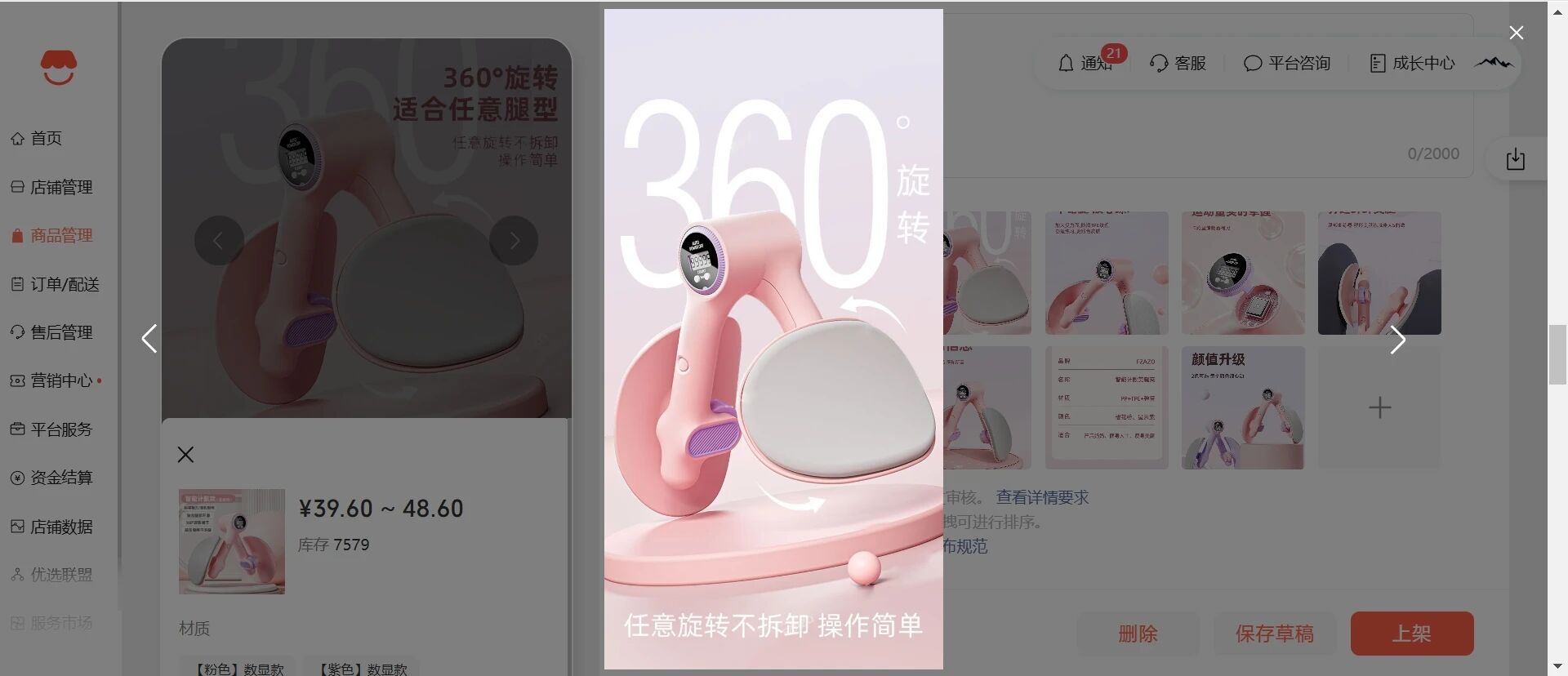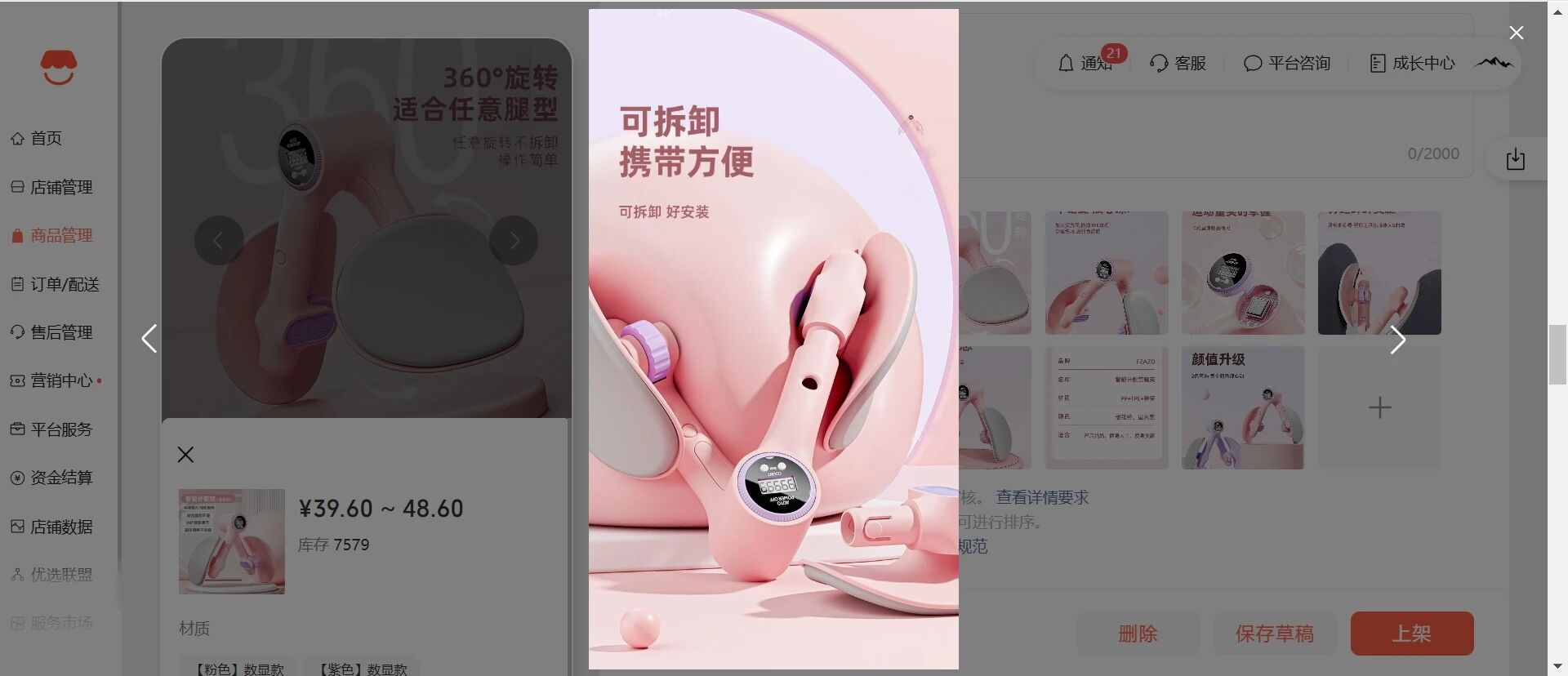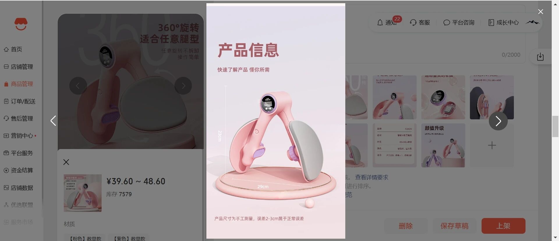上了一个美腿器的品,审核一直以涉及医疗功效不给通过,具体的图片我放出来,请问是哪里存在医疗功效了?客服说的都修改过了,还是没有通过,最后说失败多次违反平台规则不给通过,一个上午就提交了两个品,一直耗在上面,能否改进一下
